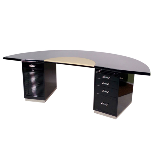 COUNTRY France YEAR c. 1970/80's DESCRIPTION Art Deco style demilune desk in the style of Ruhlmann in black lacquer. Two pedestal...