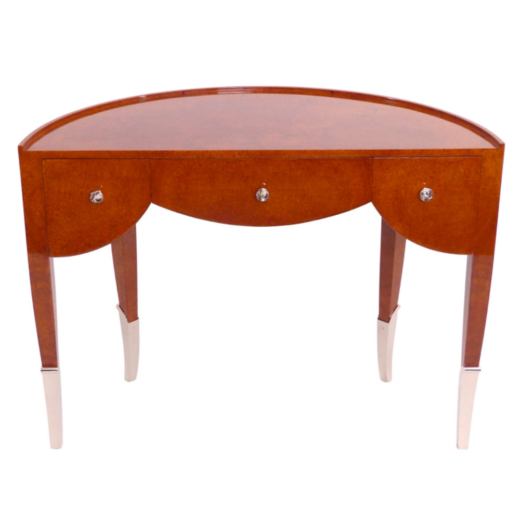 COUNTRY France YEAR c. 1930's DESCRIPTION Art Deco demilune writing table wtih scalloped frame. Amboyna burl veneer with french polish. Tall...