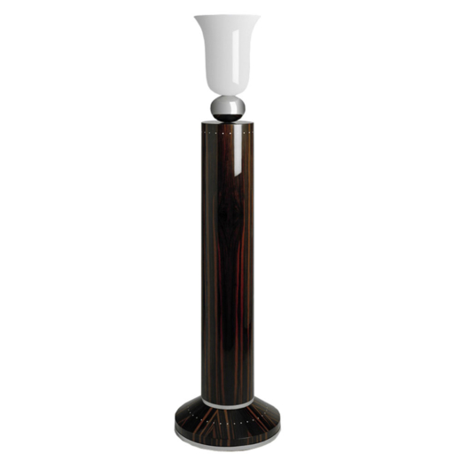 ANNE HAUCK COLLECTION DESCRIPTION As shown: Macassar Ebony Stem High Gloss Finish Ivory Lacquer Details Polished Nickel Milk Glass Shade Custom Finishes Available Dimensions 73"H x 20"Dia