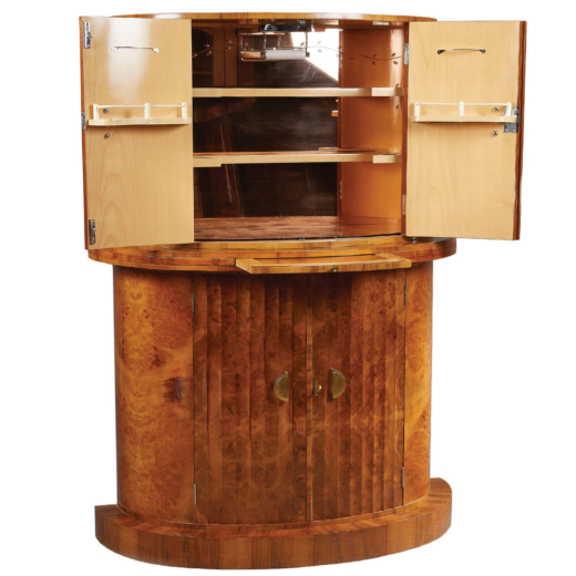 COUNTRY England YEAR c. 1940's DESCRIPTION Beautiful tall demilune bar in elm burl veneer with fluted doors and original brass hardware. Top cabinet in citron...
