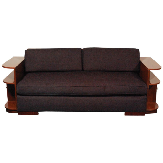 COUNTRY France YEAR c. 1930's DESCRIPTION Art Deco sofa in the style of Jean Michel Frank. Indian Rosewood frame in french polish. Built-in side tables/cabinets...