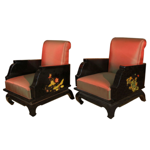 COUNTRY France YEAR c. 1920's DESCRIPTION Beautiful pair of antique chinoiserie lounge chairs. Black lacquer...