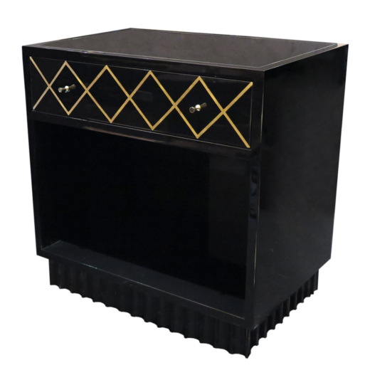 ANNE HAUCK COLLECTION DESCRIPTION As shown: Black Lacquer Frame Fluted Base Top Drawer with Gold Leaf Criss Cross Design Two Brass Knobs Black Glass Inlaid Top Open Shelf under Drawer for more storage Available in wood and with all drawers Custom sizes, woods and finishes available Dimensions 25"H x 28"W x 20"D [eltd_separator class_name="" type="normal" position="center" color="#cec6c6"...